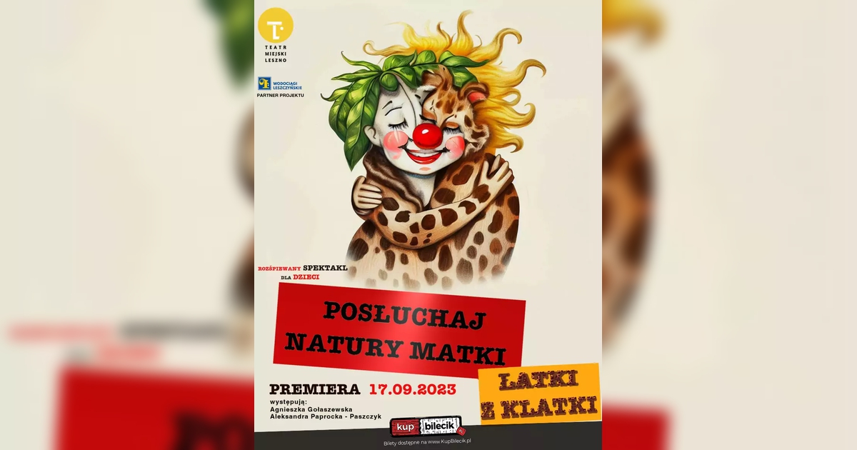 Zapraszamy na premierę! Spektakl "Posłuchaj Natury Matki - Łatki z Klatki" opowiada historię zwierząt, które pozbawione wolności nie mogą żyć pełnią szczęścia, dlatego muszą walczyć o swoją wolność i niezależność. Publiczność wraz z sympatycznym klaunem będzie odwiedzać miejsca, gdzie ogranicza się wolność zwierząt, co ma uwrażliwić młodego widza na los wykorzystanych i nieraz zapomnianych istot. Matka Natura, która będzie jedną z postaci spektaklu przypomni, jak ważne jest dbanie o środowisko, a rozbudzając empatię do zwierząt przypomni, że warto żyć w zgodzie z naturą. Dobrą zabawę zapewni również w pełni rymowany tekst, który angażuję publiczność do aktywnego słuchania jak i wspólnego śpiewania.