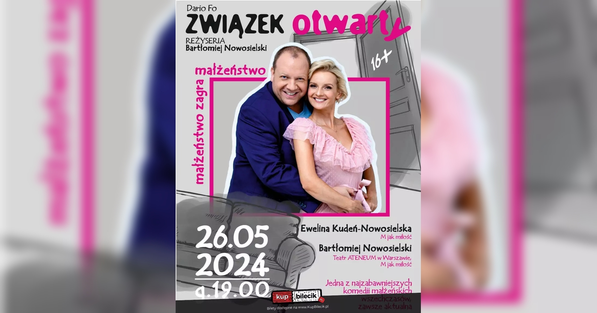 Farsa. Komedia Dell'Arte. Tekst o małżeństwie napisany przez… małżeństwo, w sensie jak najbardziej dosłownym: Dario Fo, laureat Literackiej Nagrody Nobla z 1997 roku, stworzył "Związek otwarty" wraz z żoną, Franką Rame. Jego osią jest kpina i zabawa instytucją małżeństwa, żonglowanie stereotypami odnoszącymi się do natury kobiet i mężczyzn. Tytułowy "nowoczesny" związek otwarty to związek wolnych - tzn. niewiernych sobie - małżonków. Sztuka o małżeństwie napisana przez małżeństwo. Więc jak najbardziej autentyczna i taka, po której powiecie - "faktycznie tak jest!".