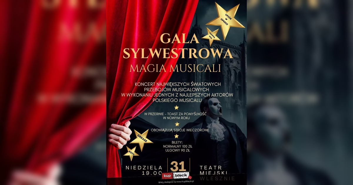 Takiego koncertu w Teatrze Miejskim jeszcze nie było! Gala Sylwestrowa "Magia Musicali" to niezapomniane wydarzenie, podczas którego jedni z najlepszych polskich aktorów musicalowych zabiorą Państwa w muzyczną podróż przez świat największych hitów tego gatunku.